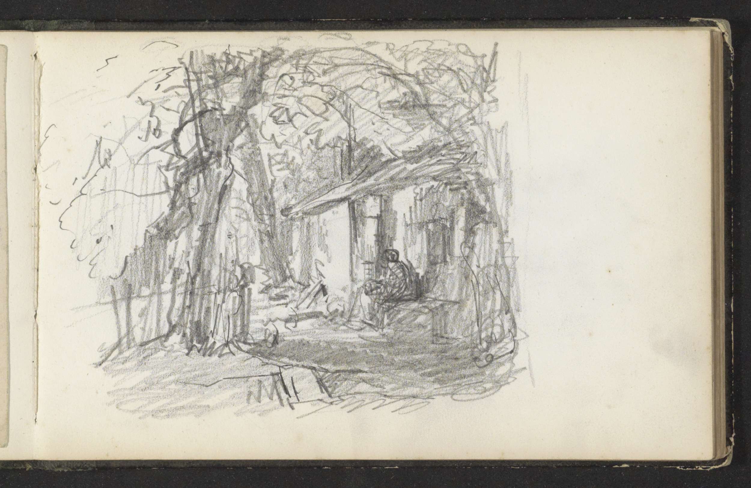 Figuur zittend voor een plattelandshuis tussen de bomen
