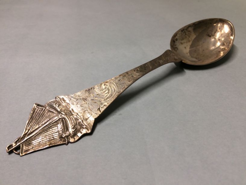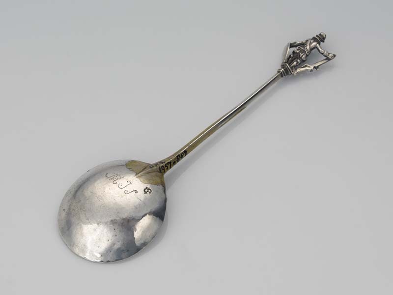 Gedachtenislepel met bekroning met een staande vrouw...