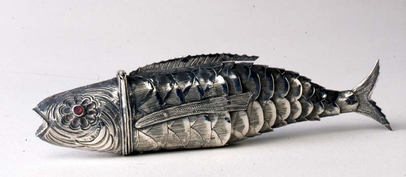 Etui in de vorm van een vis met ogen van roodgekleur...