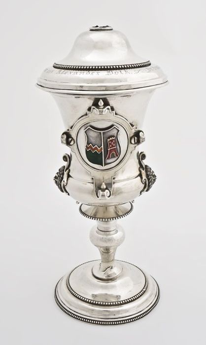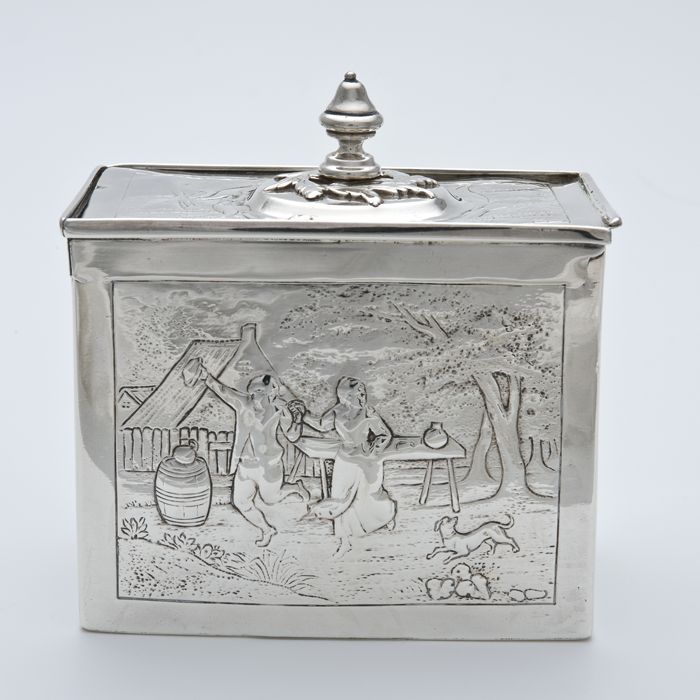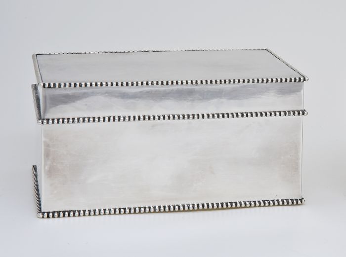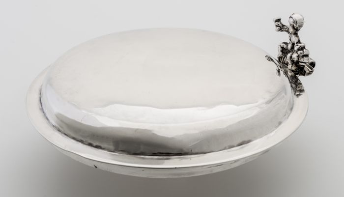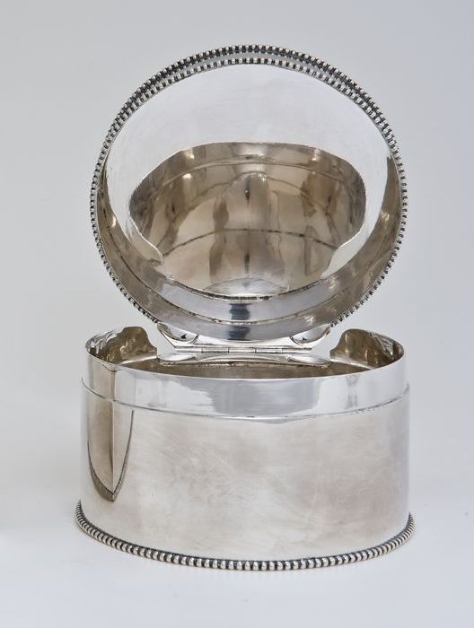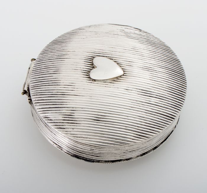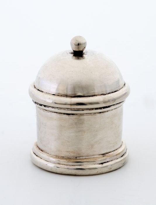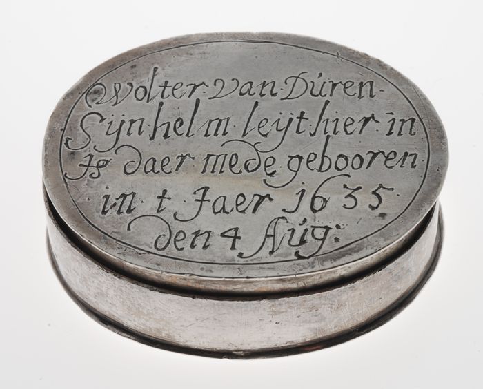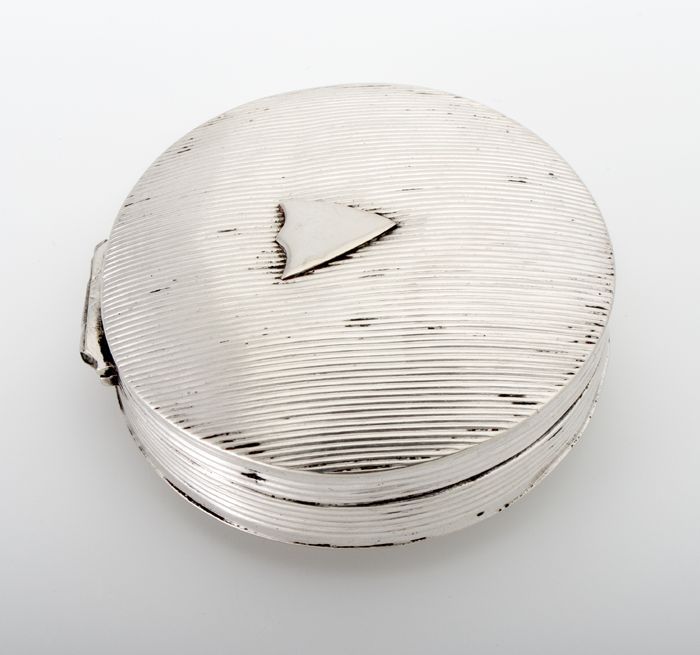 Ovaal zilveren helmdoos met opschrift "Wolter van Du...