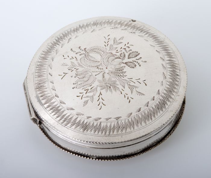 Rond zilveren pepermuntdoosje, met "G. Stevenson ger...