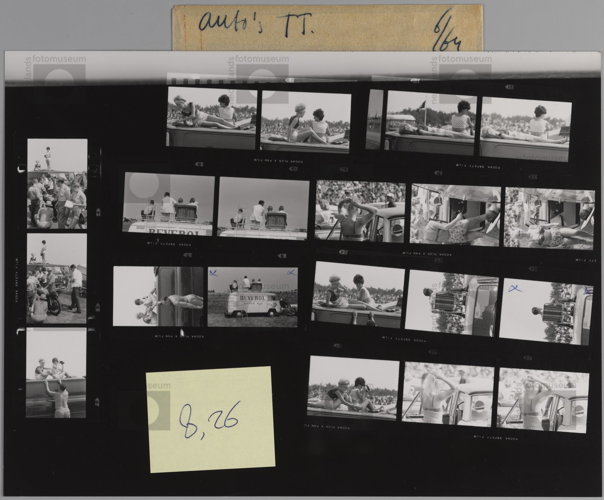 TT Assen motorwedstrijden. Toeschouwers bovenop auto...