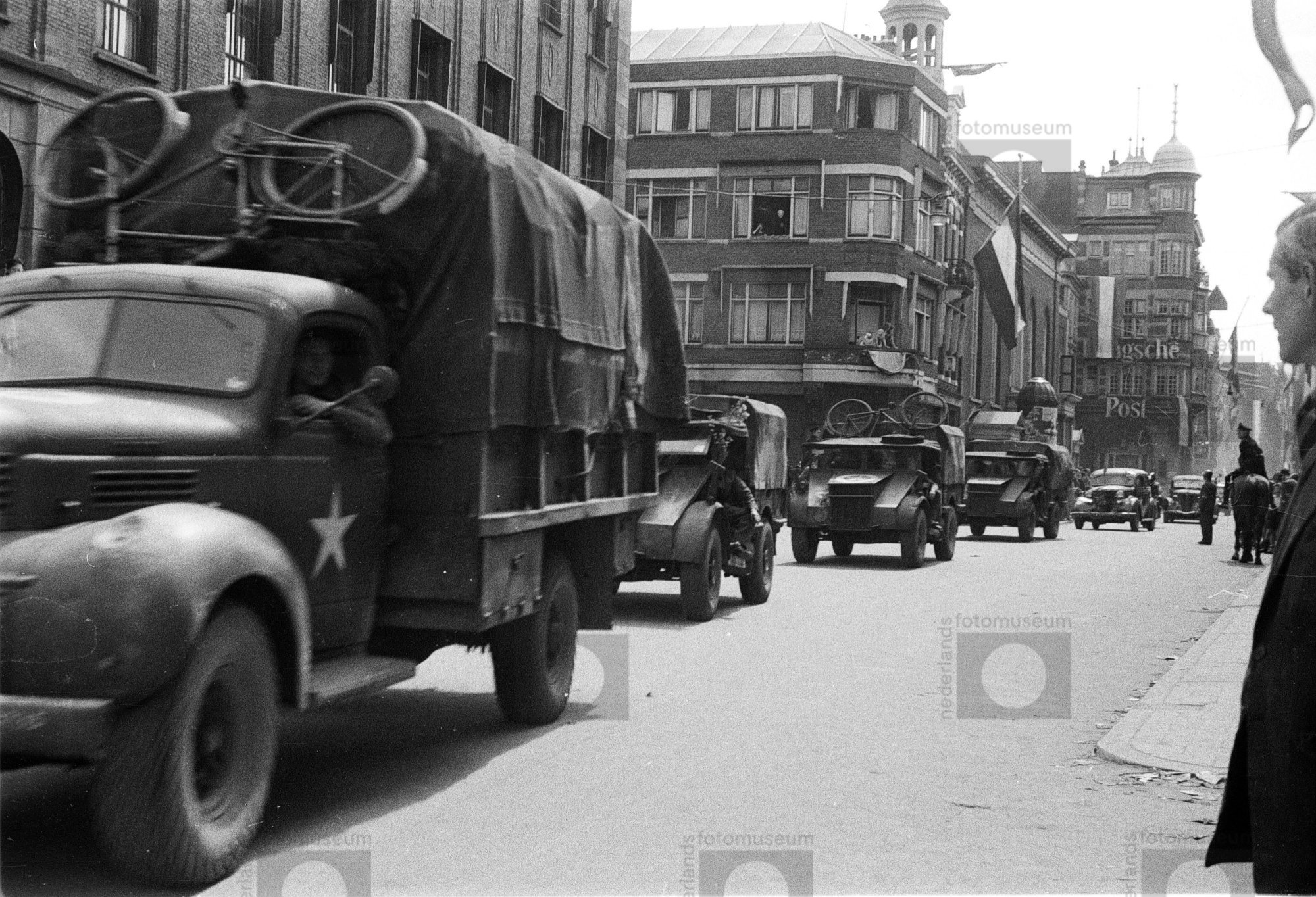 Geallieerde voertuigen rijden in optocht voor paleis...
