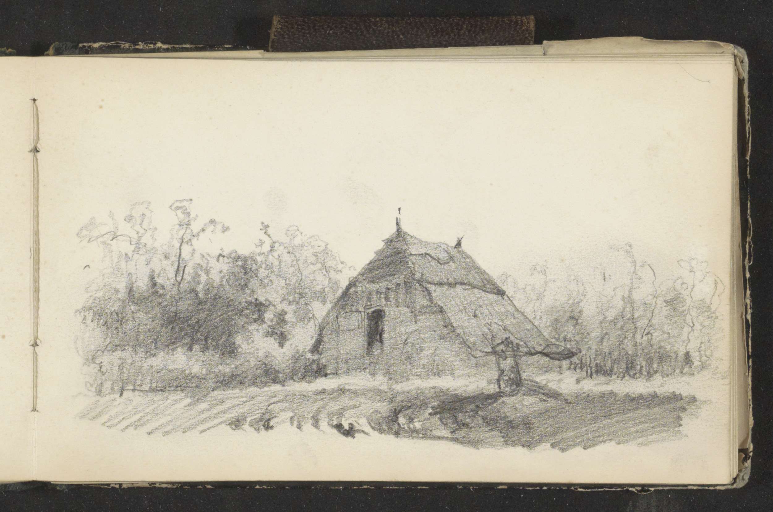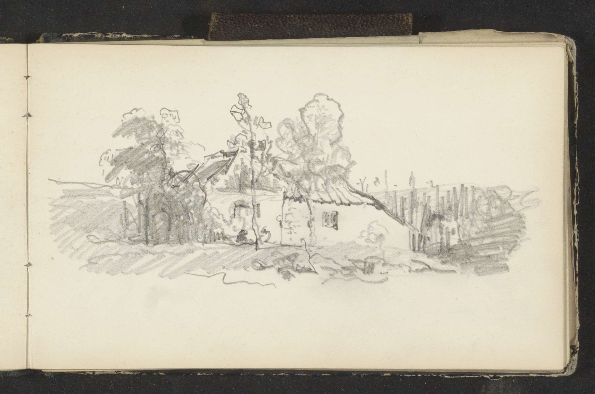 Huis met een puntdak en een schoorsteen tussen de bomen
