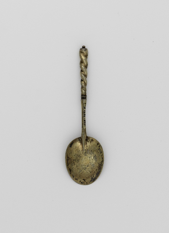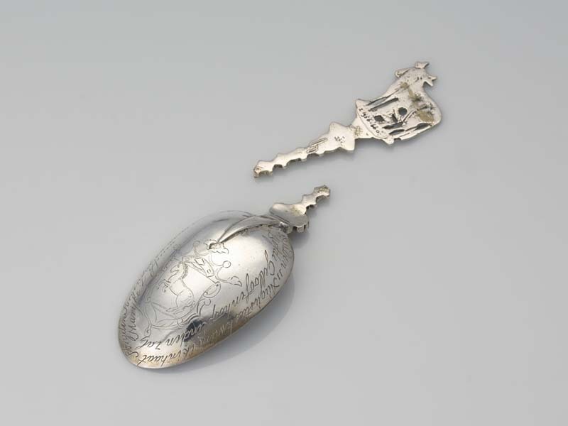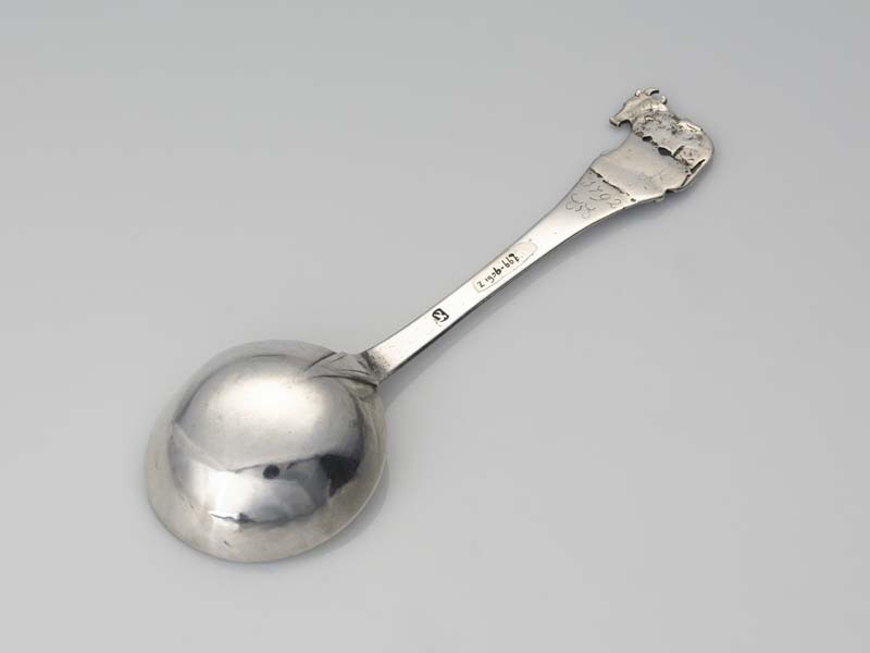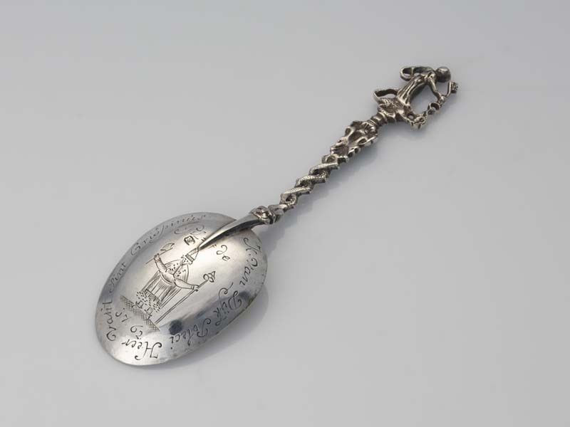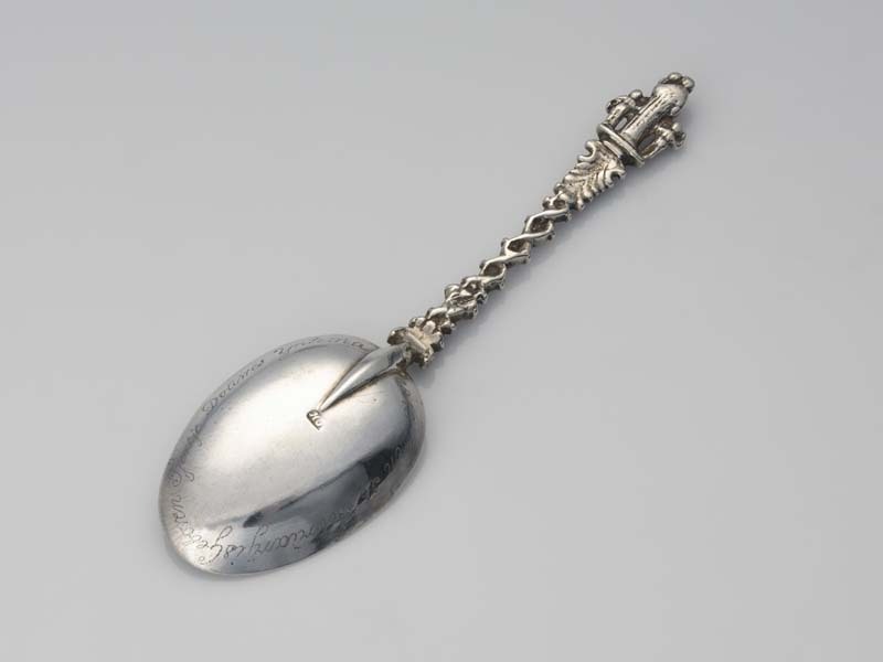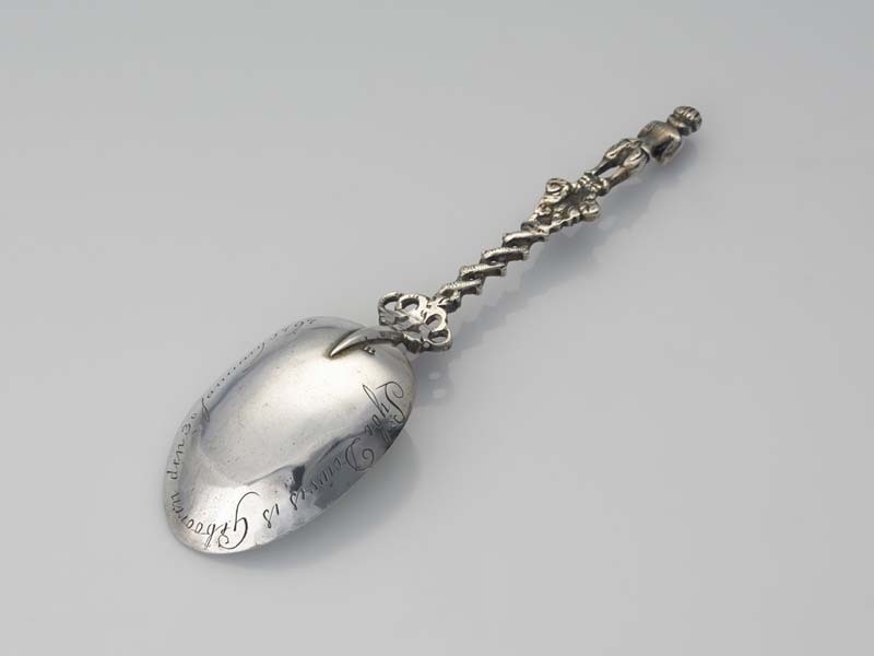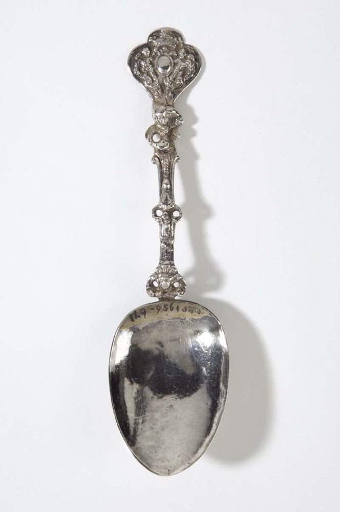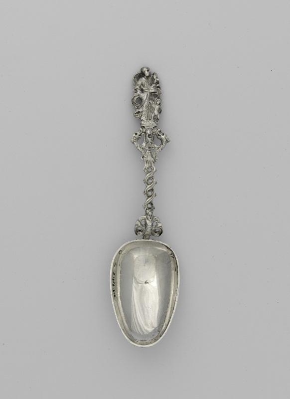 Geboortelepel met bekroning met staande vrouwenfiguu...