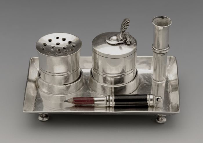 Zilveren miniatuur inktstel: blad met inktpot, zands...