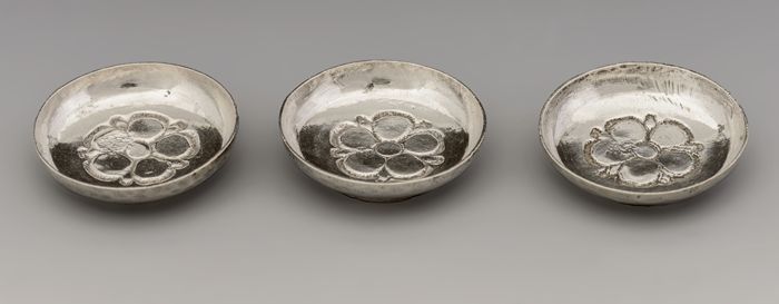 Drie zilveren ronde miniatuur schotels met bloem