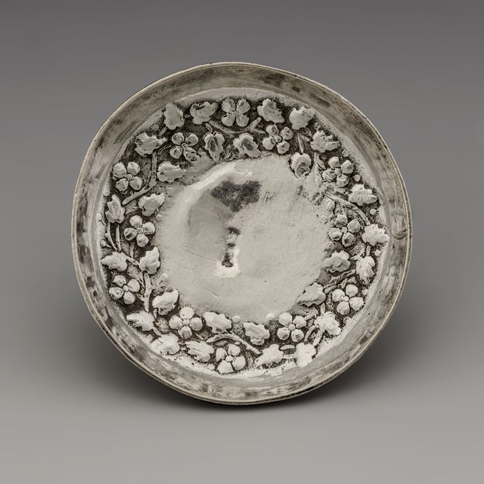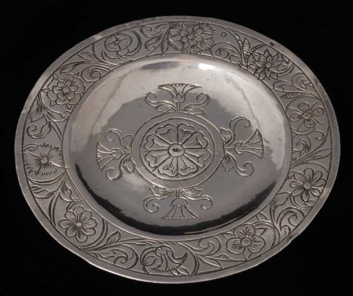 Zilveren ronde miniatuur schotel met bloemmotief