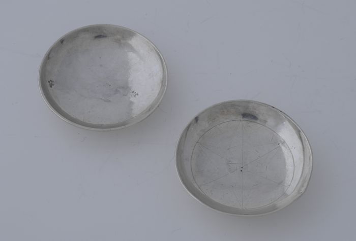 Twee ronde zilveren miniatuur schotels op standring ...
