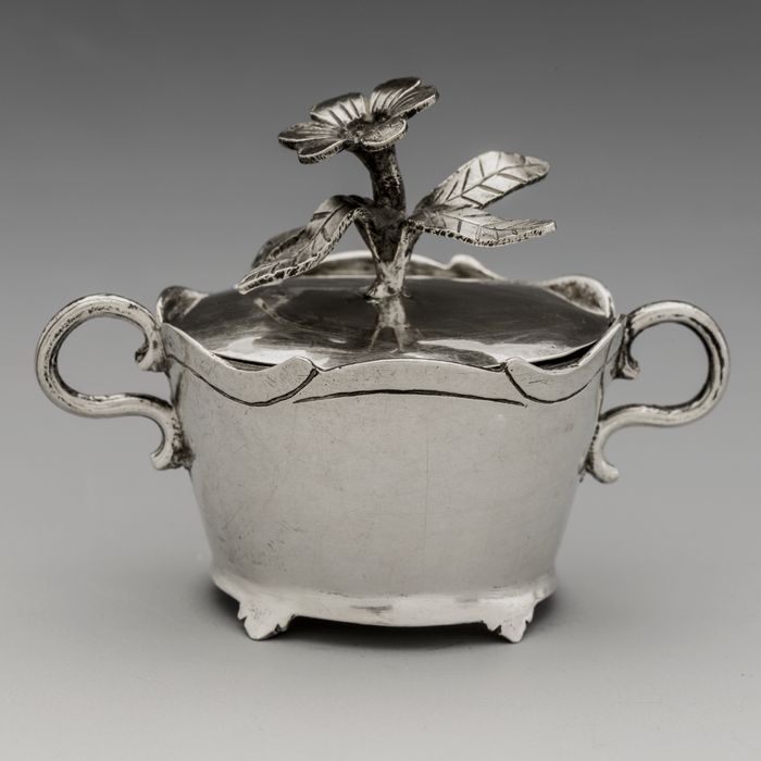 Zilveren miniatuur soepterrine met deksel waarop bloem