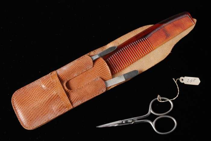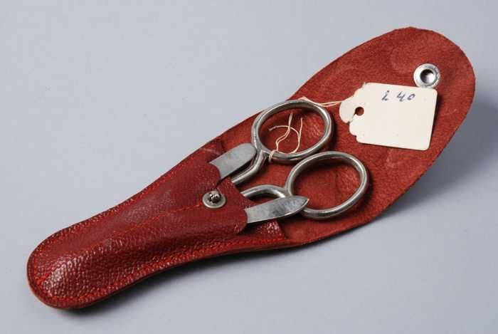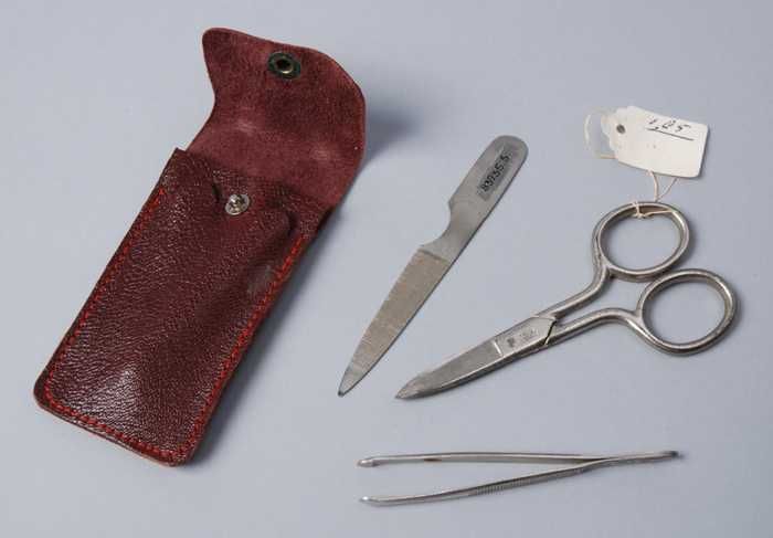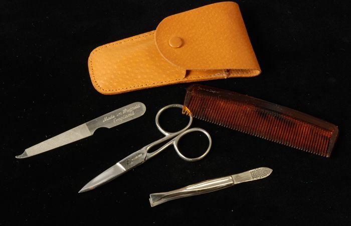 Vierdelige manicureset of toiletset in een kleine dr...