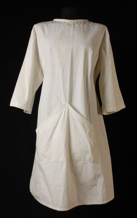 Kappersjas van witte stof, halflang en gerend met gr...