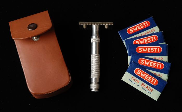 Scheerapparaat in een bruine houder met enkele pakje...