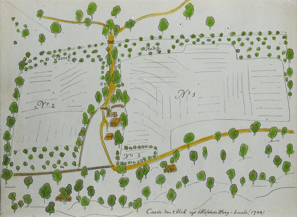 Kaart van Hoog-Buurloo uit 1708. Recht boven weg naa...