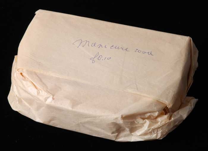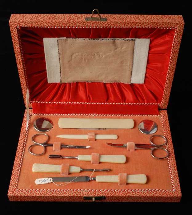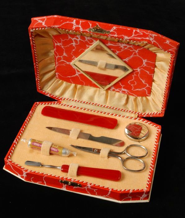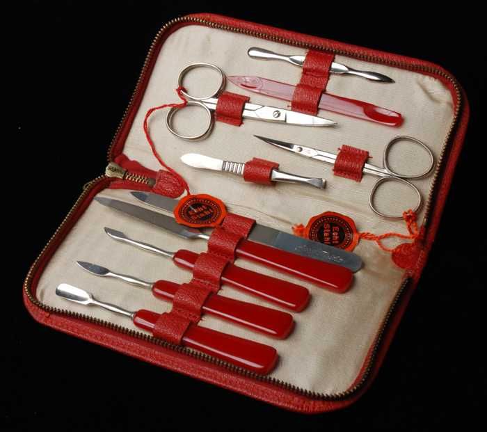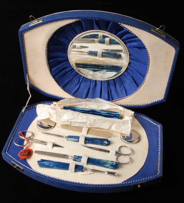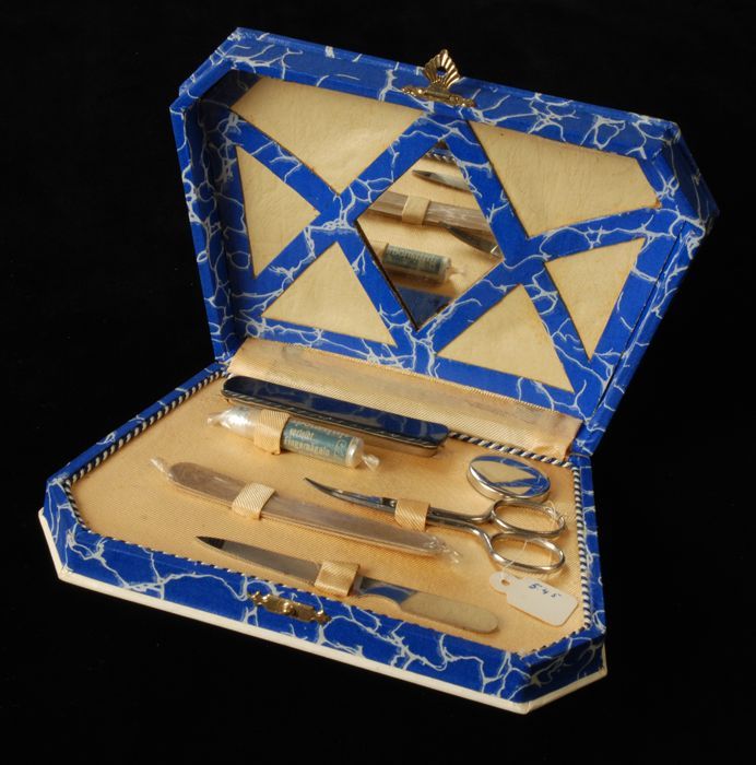 Vierdelige manicureset of toiletset in een kleine dr...