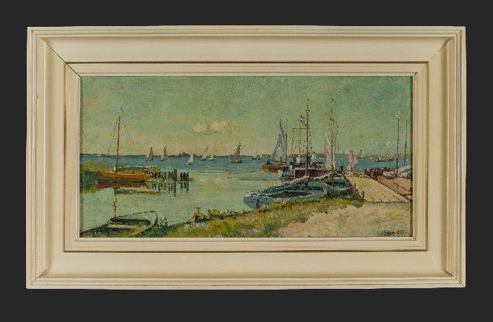 Zeilbootjes op het water, aan de wal en steiger