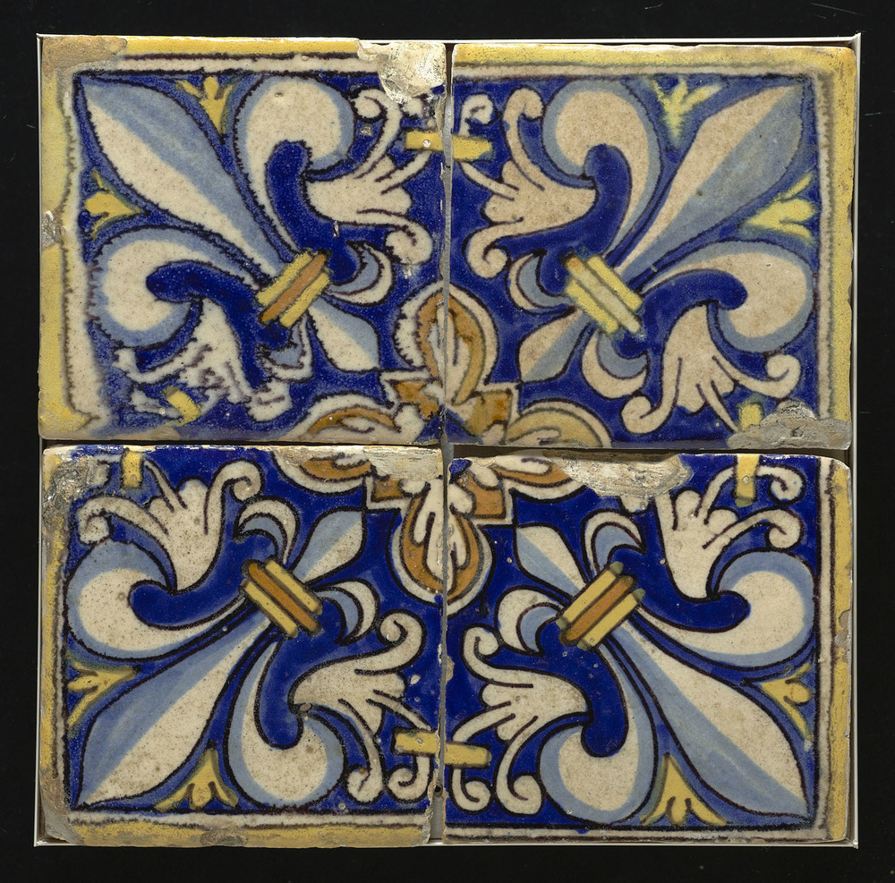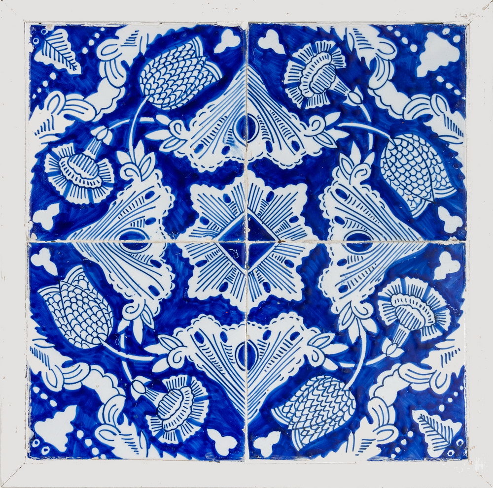 Tegelveld van 4 blauwe tegels van aardewerk met ting...