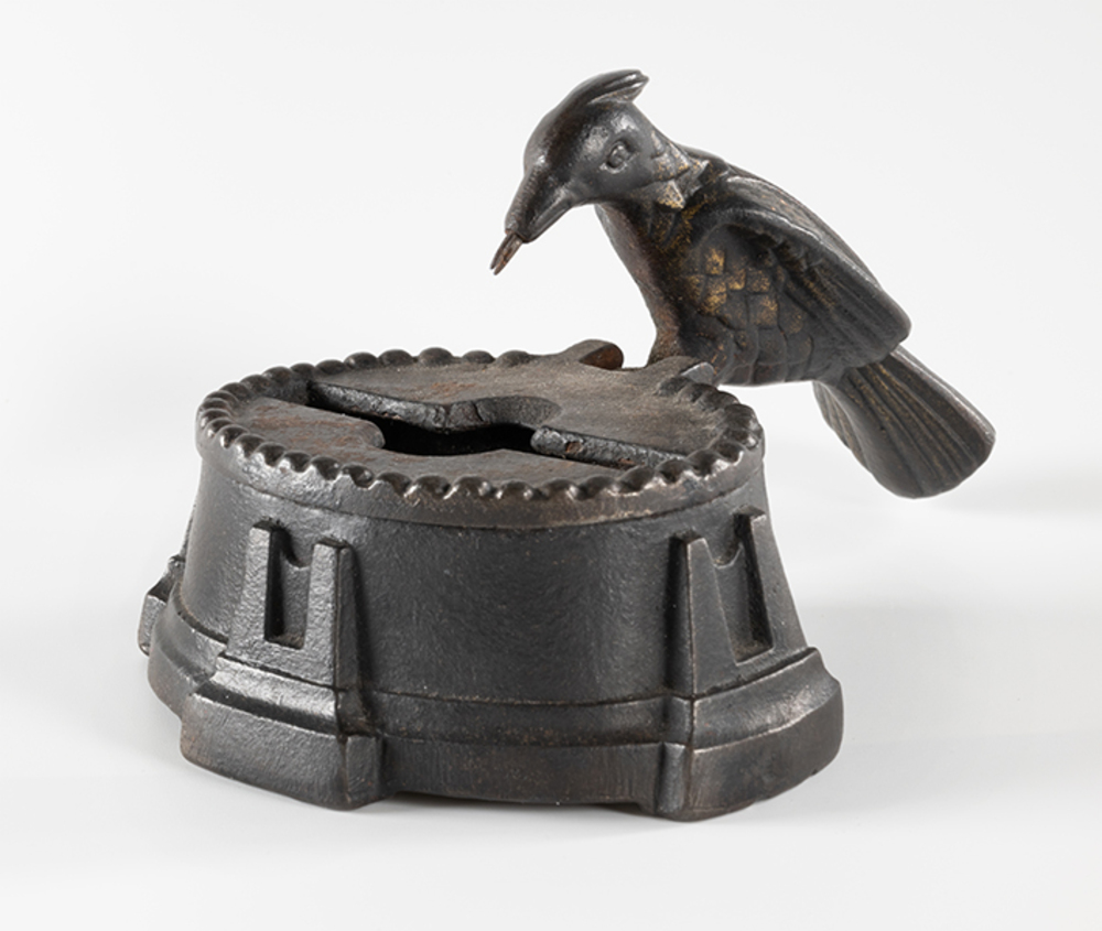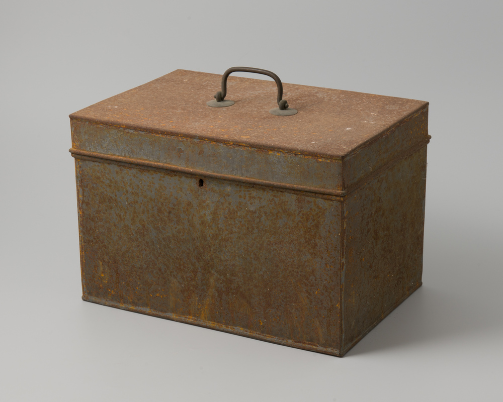 Klein voorwerp van lood dat bovenop vellen papier wo...