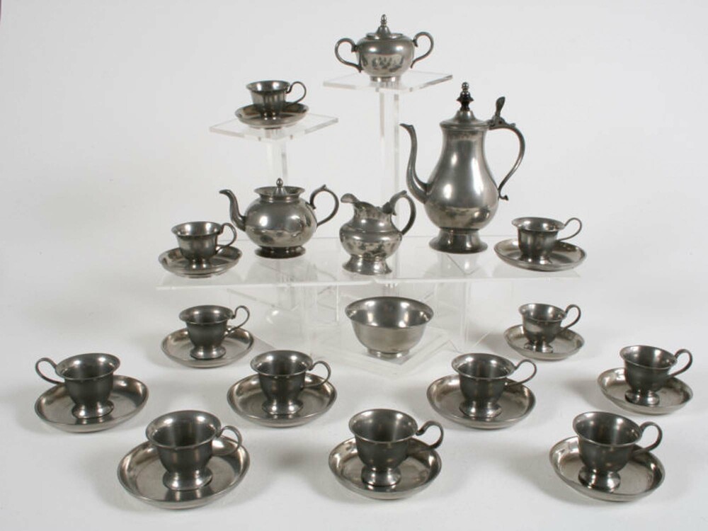 theeservies van tin, vervaardigd door Meeuws en Zoon...