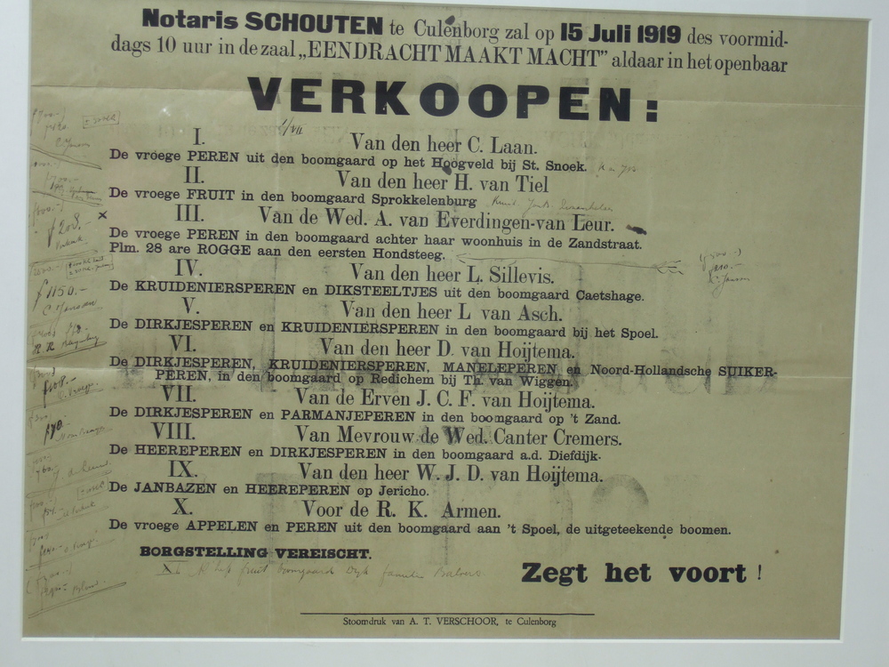 Affiche in lijst voor fruitveiling op 15 Juli 1919, ...