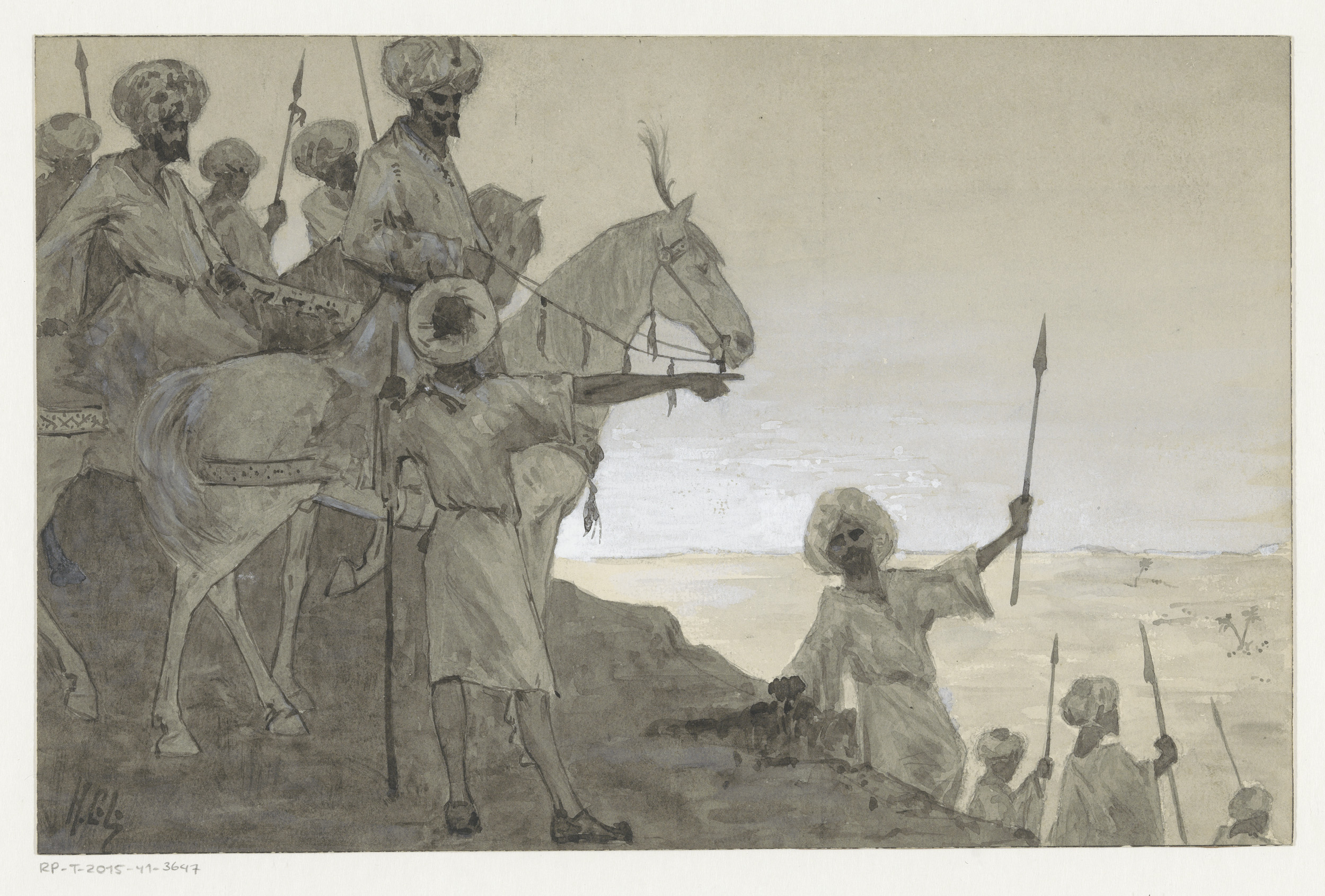 Strijders te paard in een woestijnlandschap