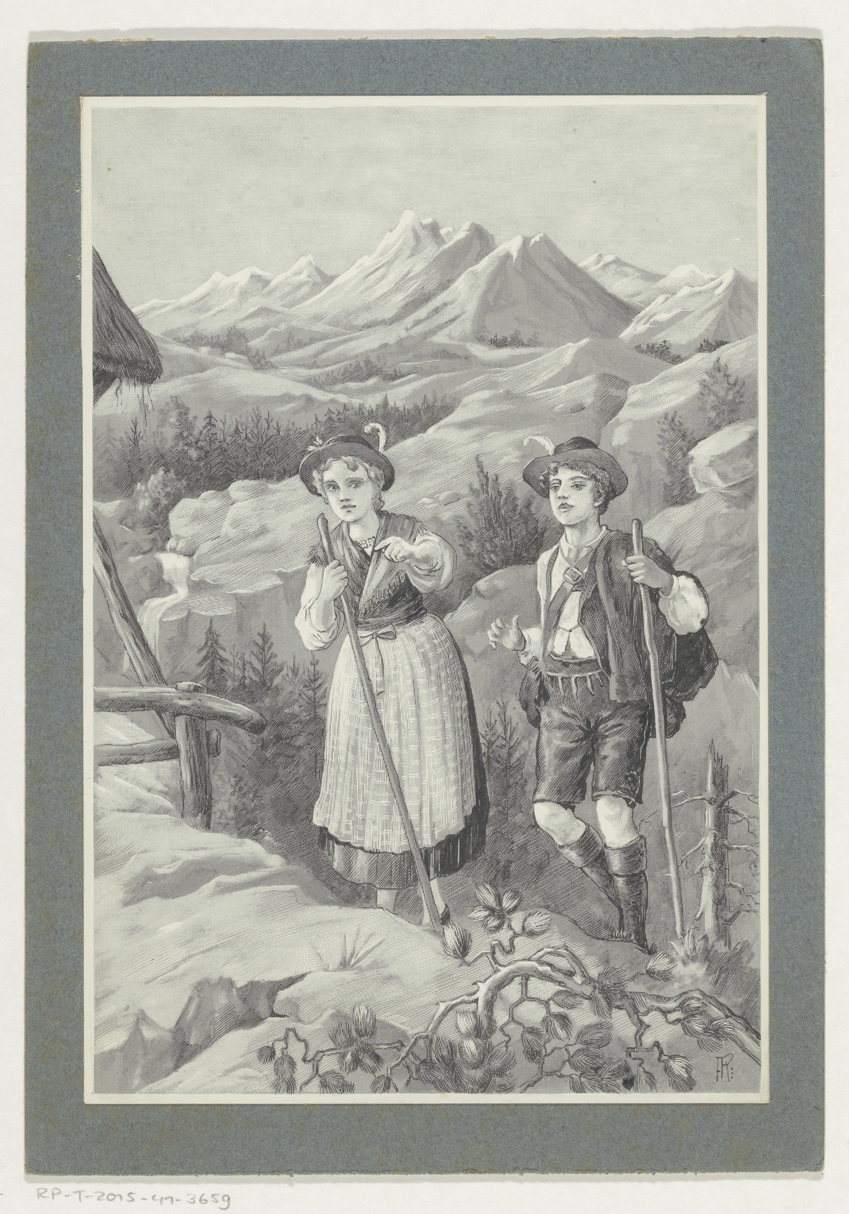 Jongen en meisje wandelen in een berglandschap