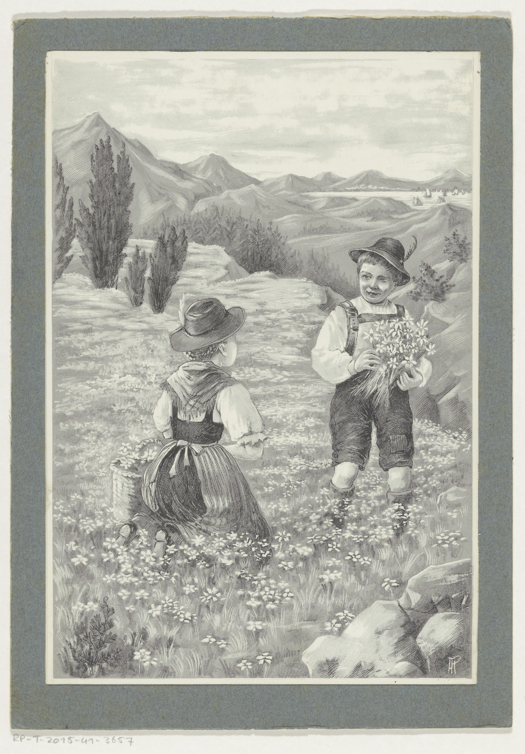 Jongen en meisje plukken bloemen in een veld