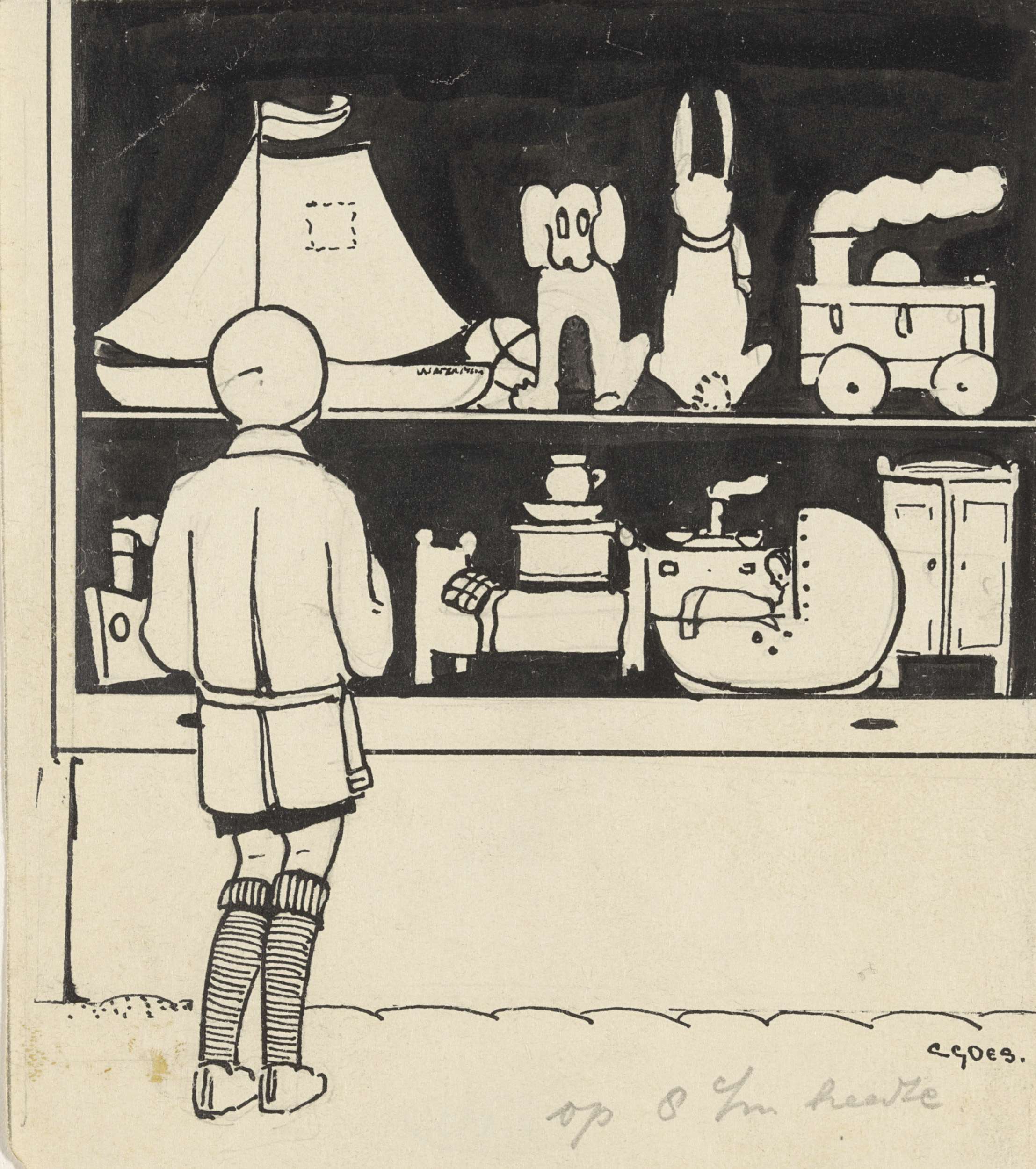 Dick kijkt naar de etalage van een speelgoedwinkel