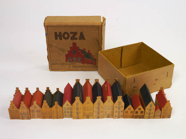 Ontwerp van doosje met 16 Amsterdamse grachtenhuisje...