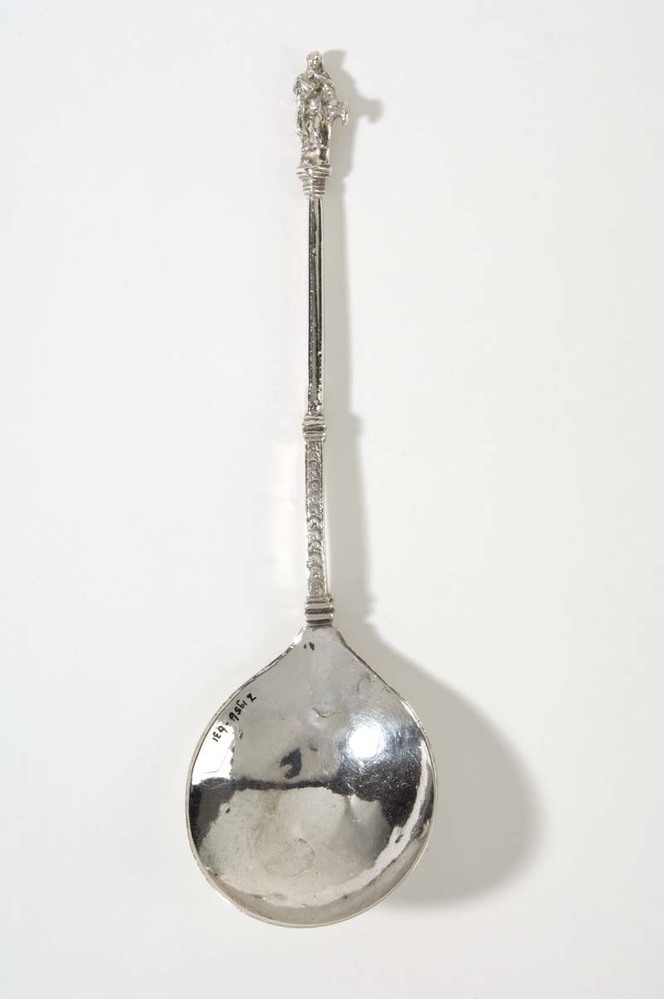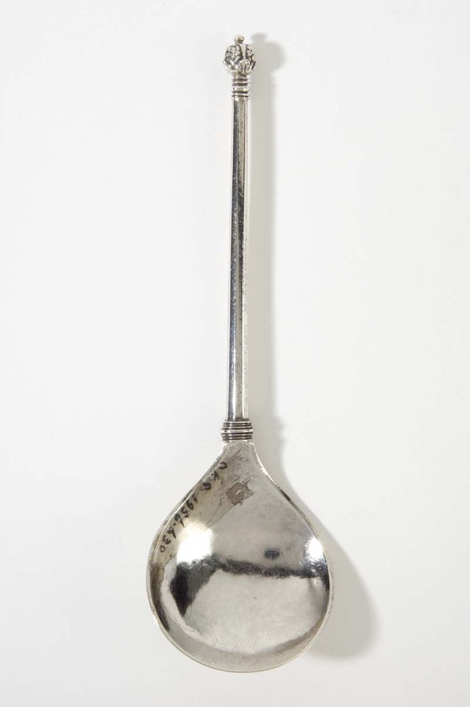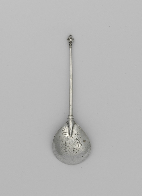 Lepel met als bekroning pijnappel met knopje erop en...