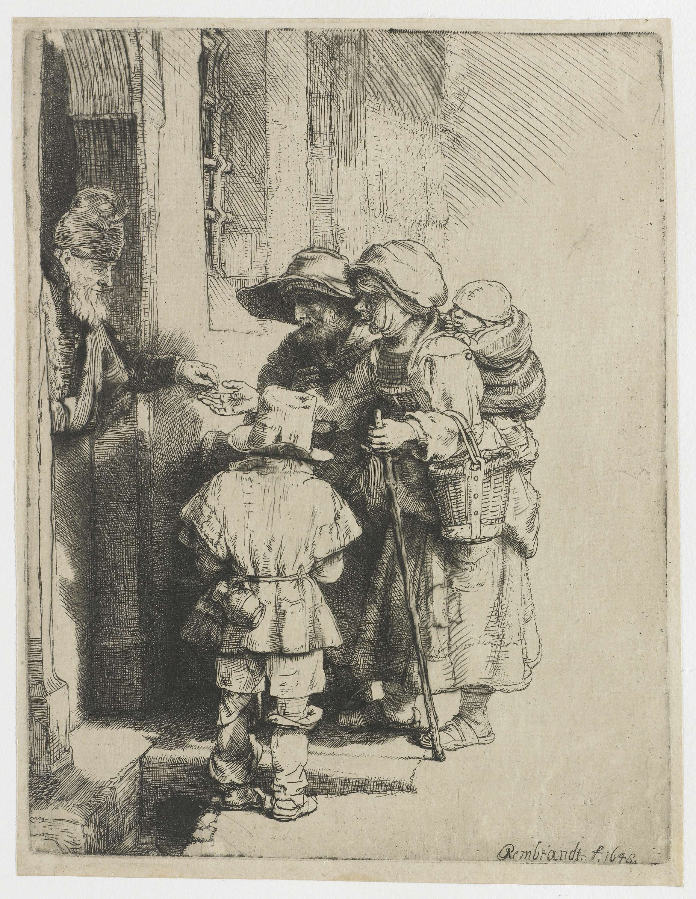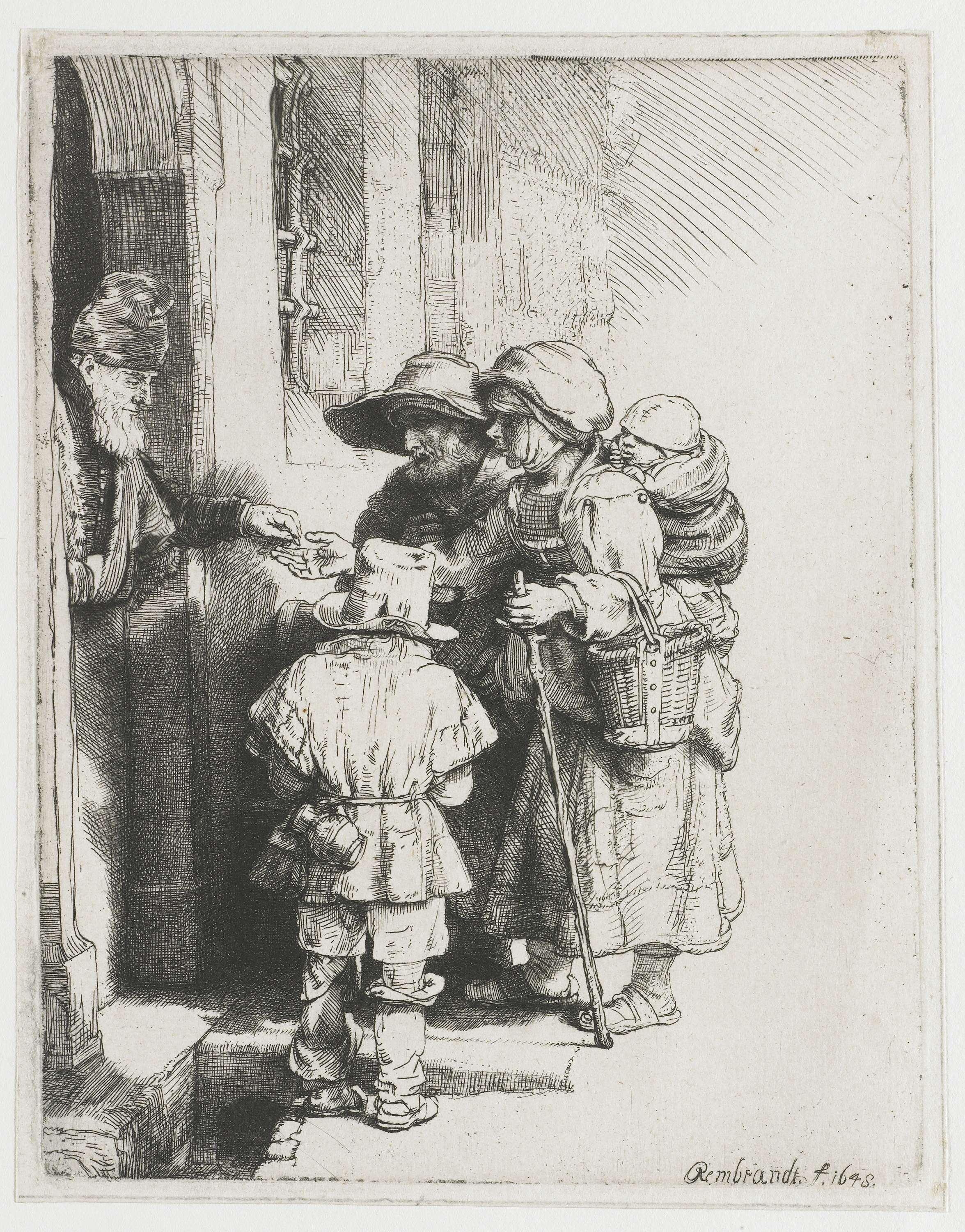 A blind hurdy-gurdy player and family receiving alms
