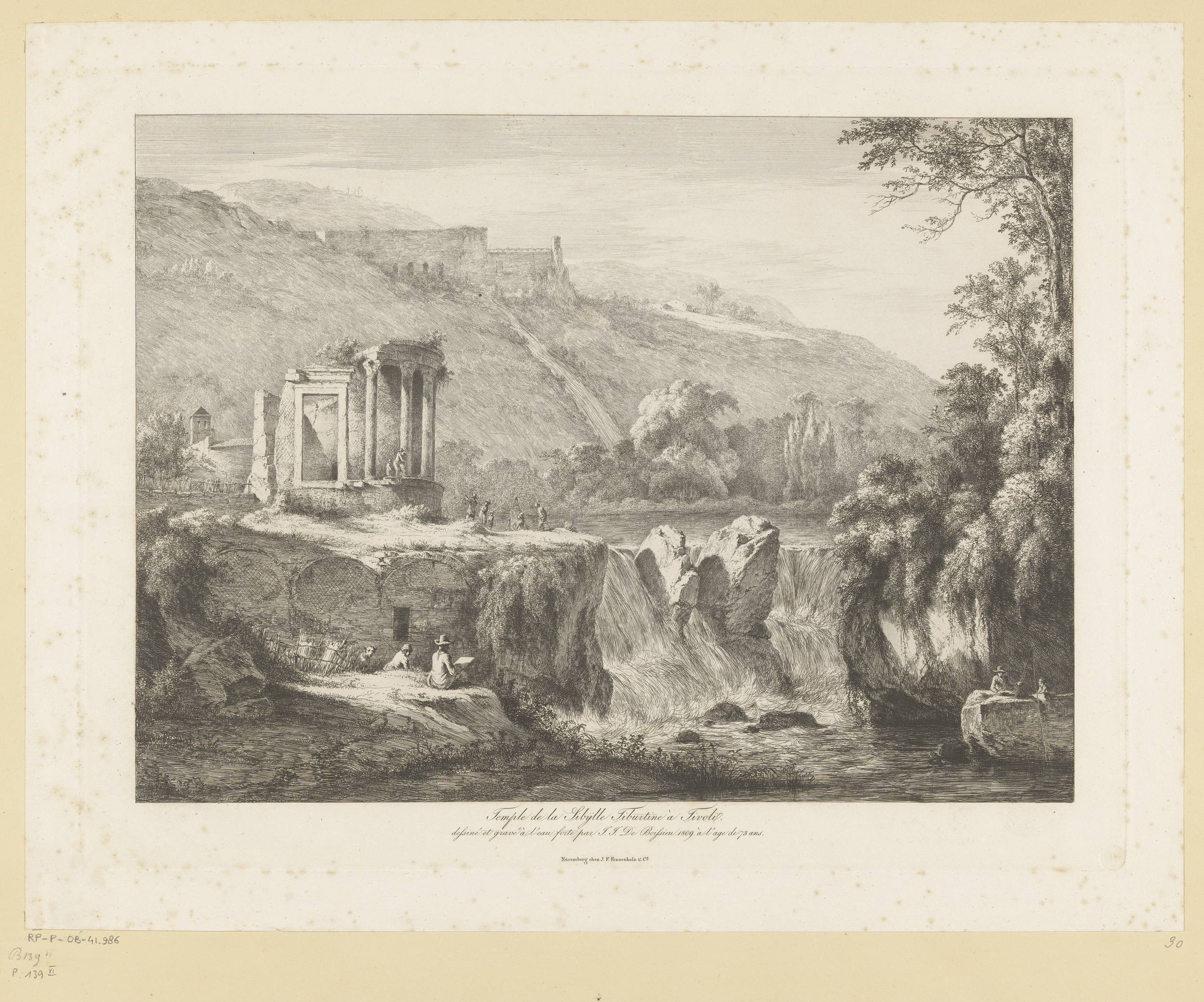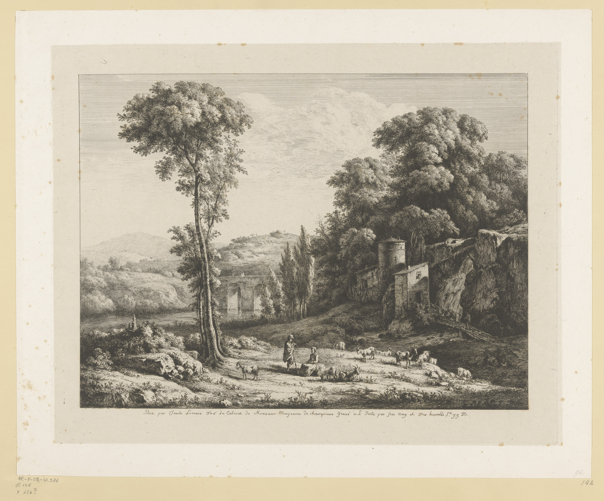 Landschap met figuren bij een ommuurd gebouw