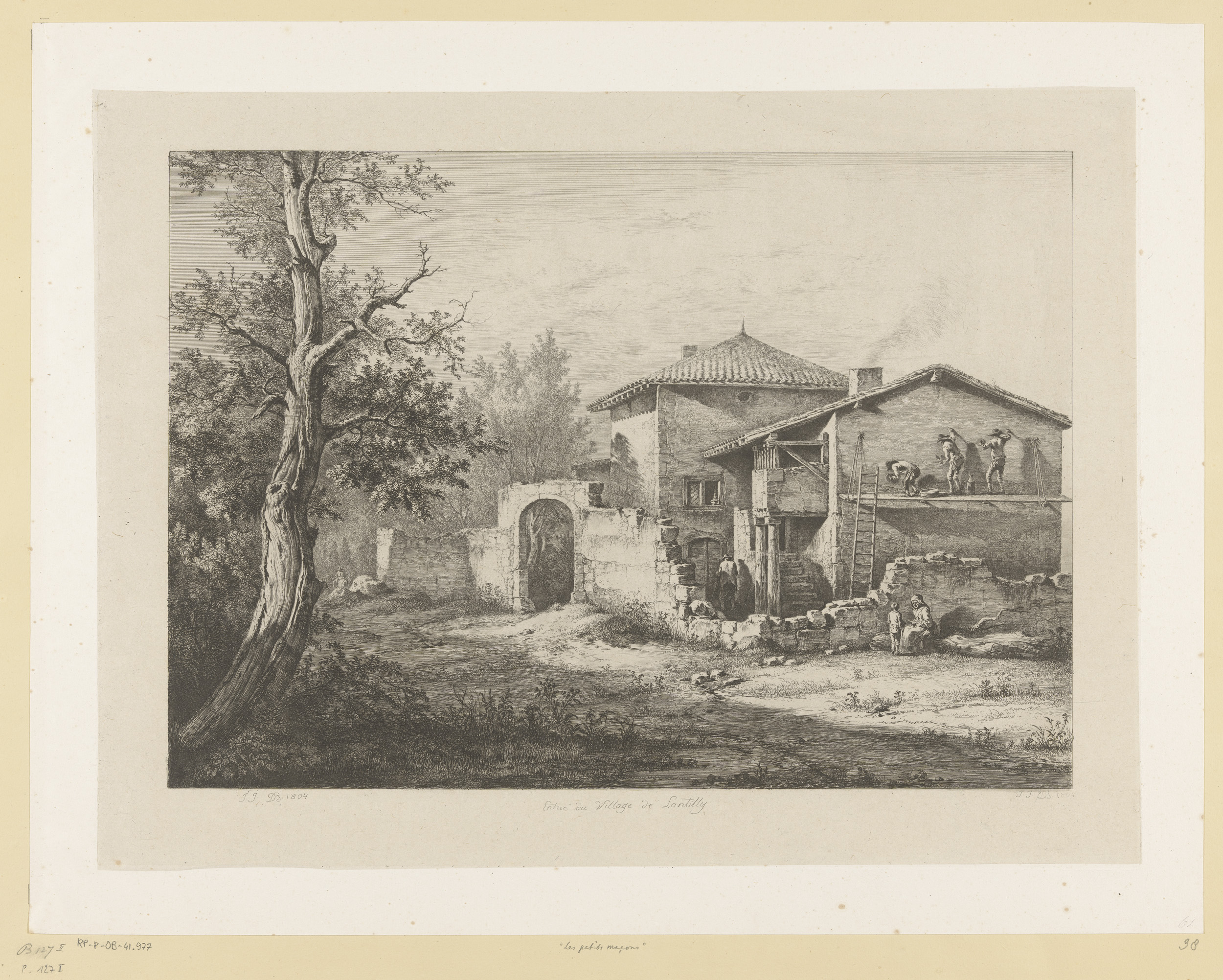 Landschap met metselaars bij een huis