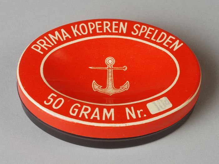 Ovaal rood, wit en zwart blik, "Prima koperen spelden"