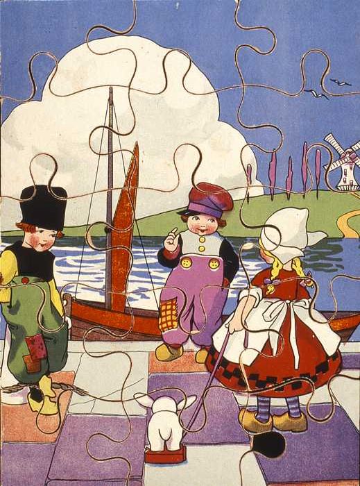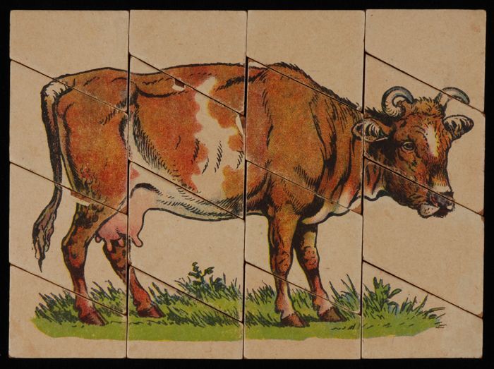 Dubbelzijdige legpuzzel: koe en kat, beiden met voor...
