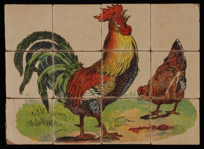 Dubbelzijdige legpuzzel: ezel en haan met kip, beide...