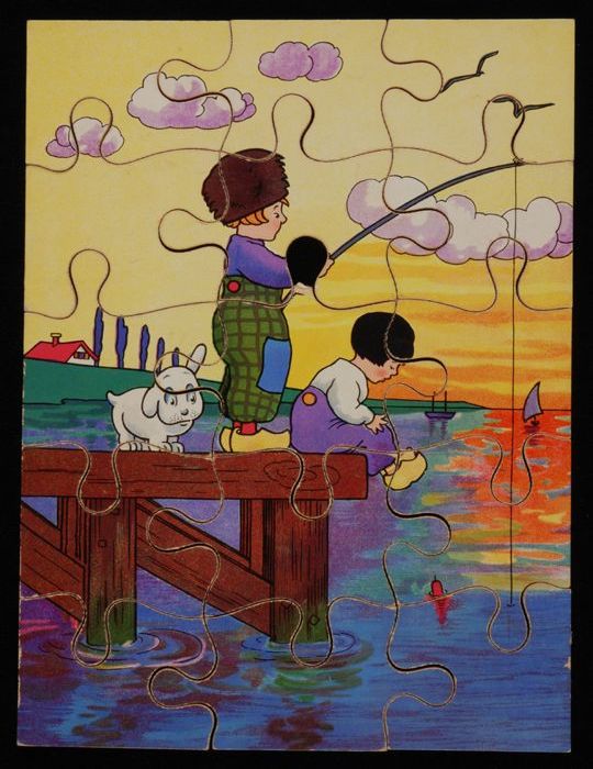 Eenvoudige legpuzzel met voorbeeld: twee jongens vis...