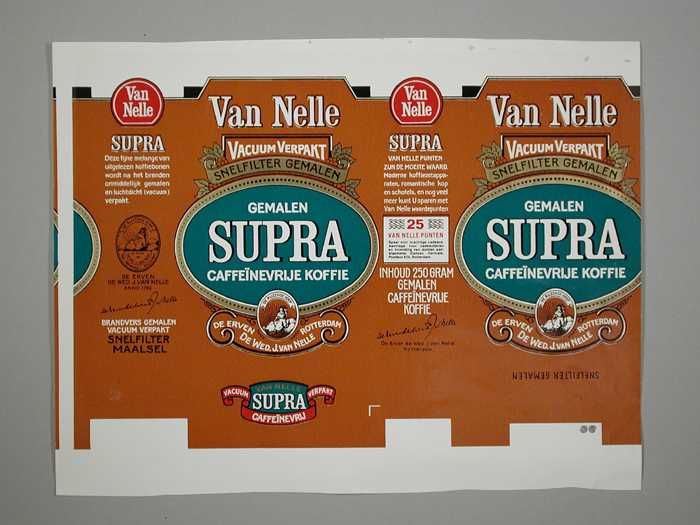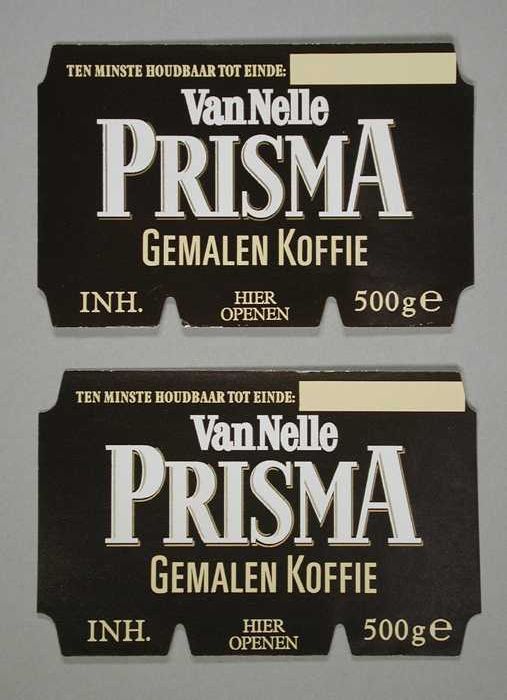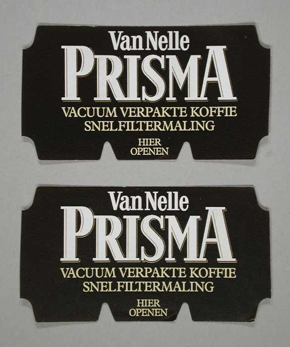 Twee bruine, papieren labels VAN NELLE PRISMA KOFFIE...