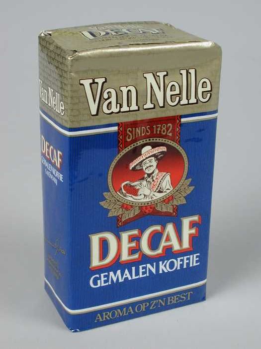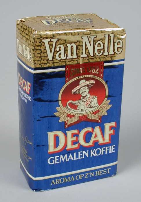 Blauw en goud, papieren pak VAN NELLE KOFFIE, cafeïn...