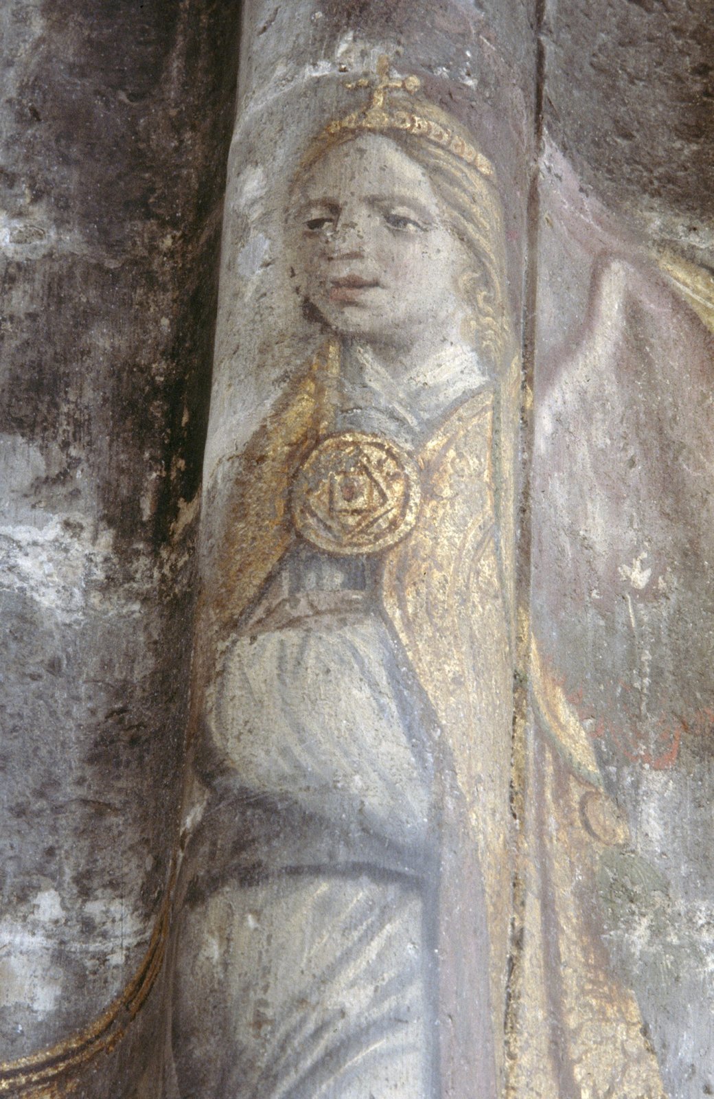 Interieur, koor, pijler met beschildering