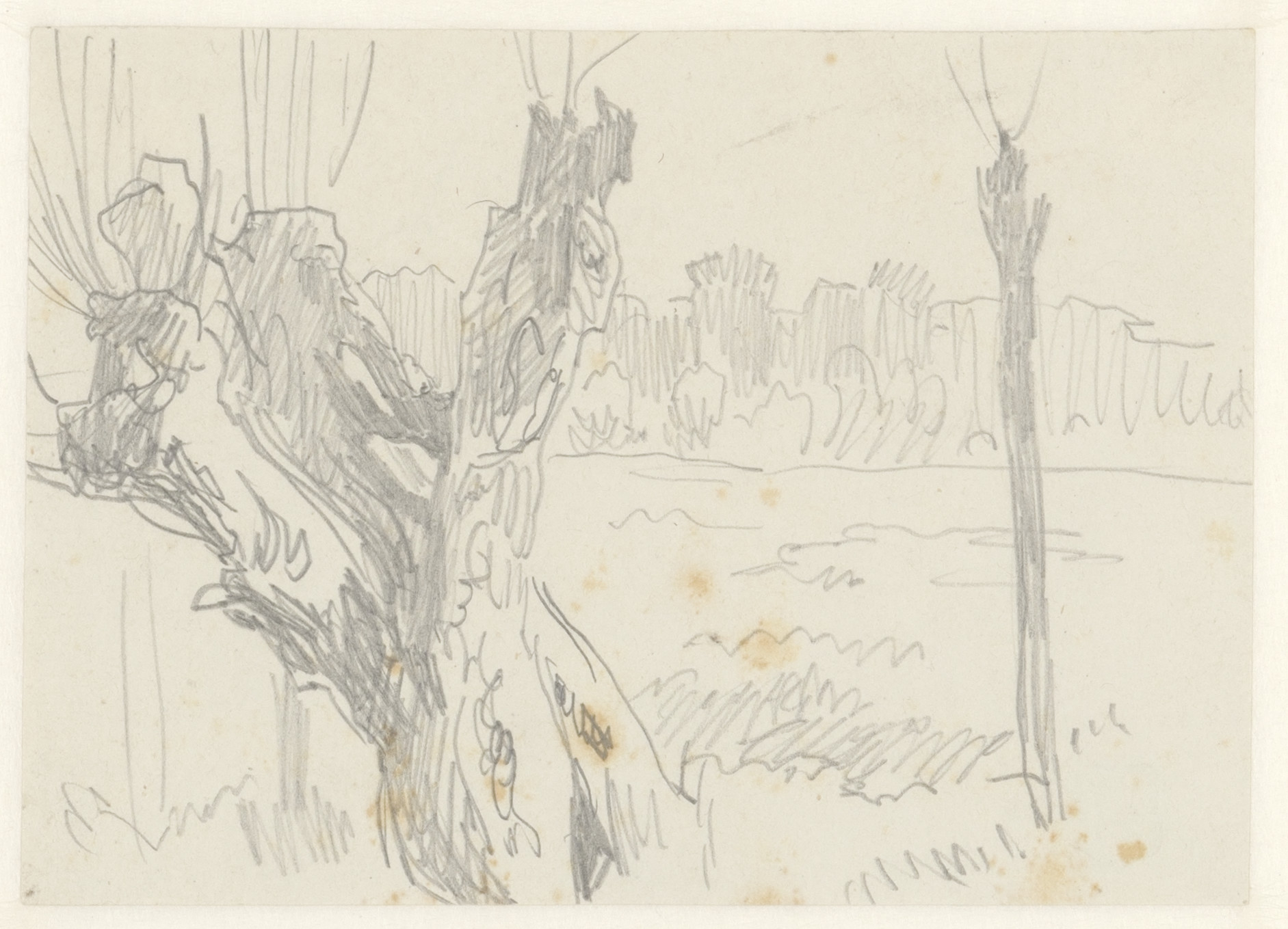 Landschap met links op de voorgrond een knotwilg (re...