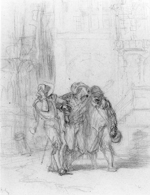 Dronken figuren, met een poort en huizen op de achte...