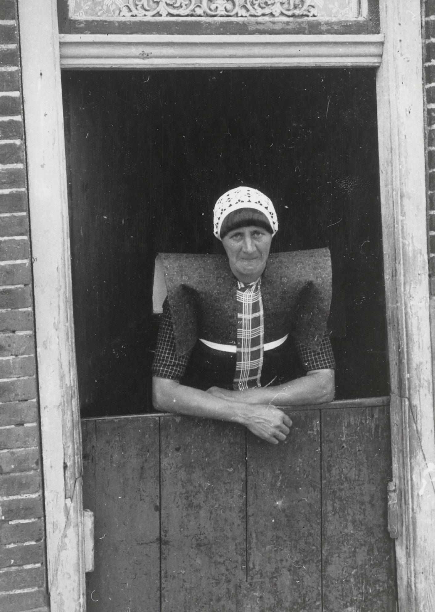 Vrouw in dracht uit Volendam, 1938 (zwart-wit foto)