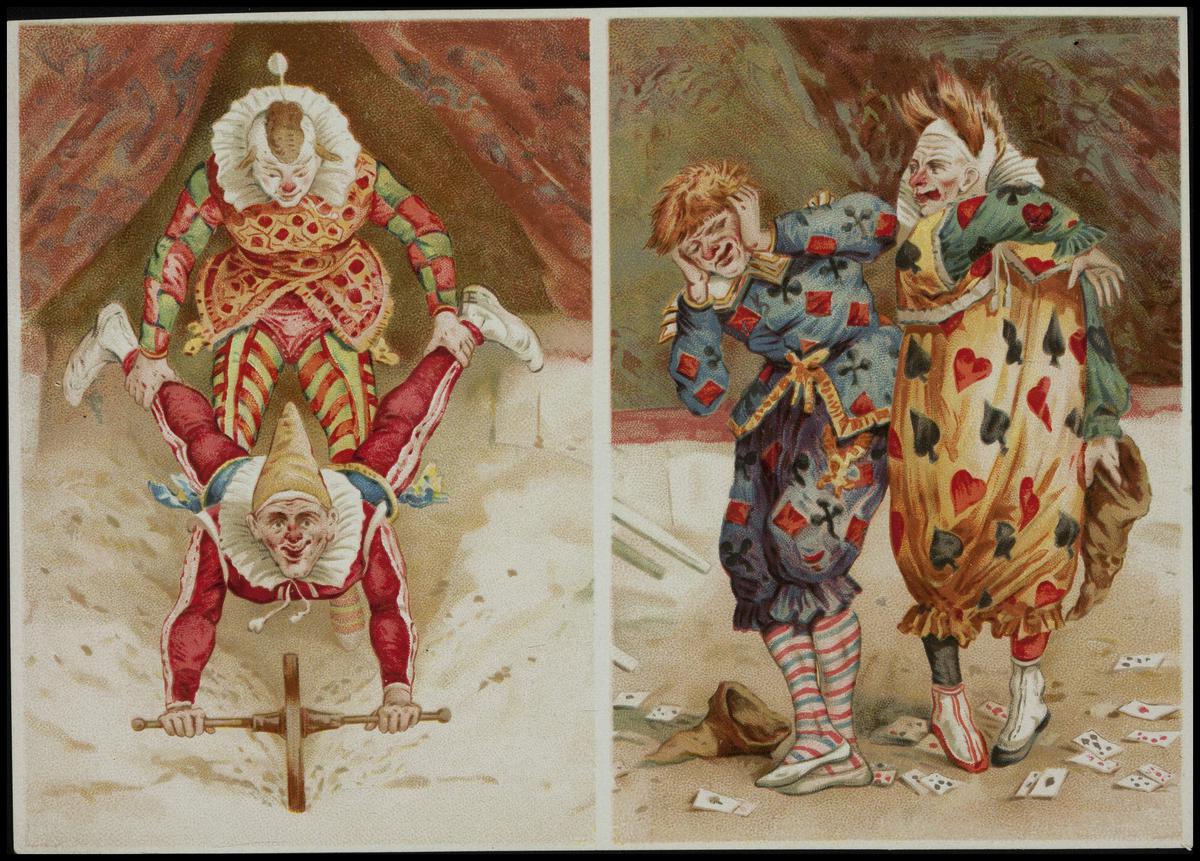 Achterzijde van ansichtkaart fantasieclowns