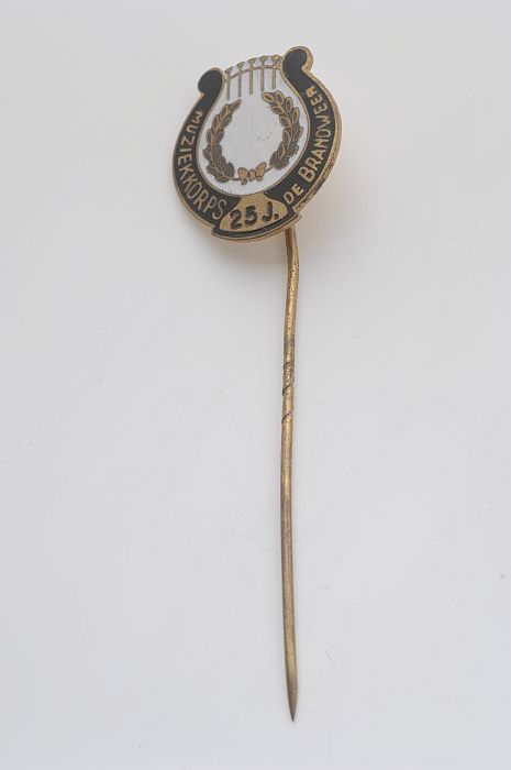 Speld met lauwerkrans, harp en "MUZIEKKORPS 25 J. DE...
