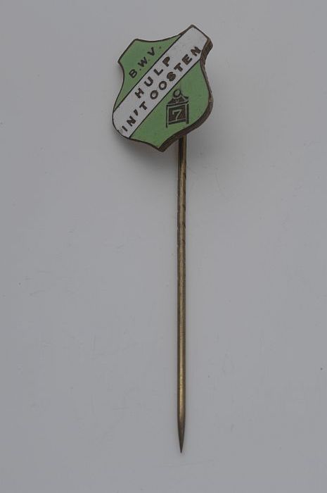 Groen-witte speld met "B.W.V. HULP IN ´T OOSTEN 7"
