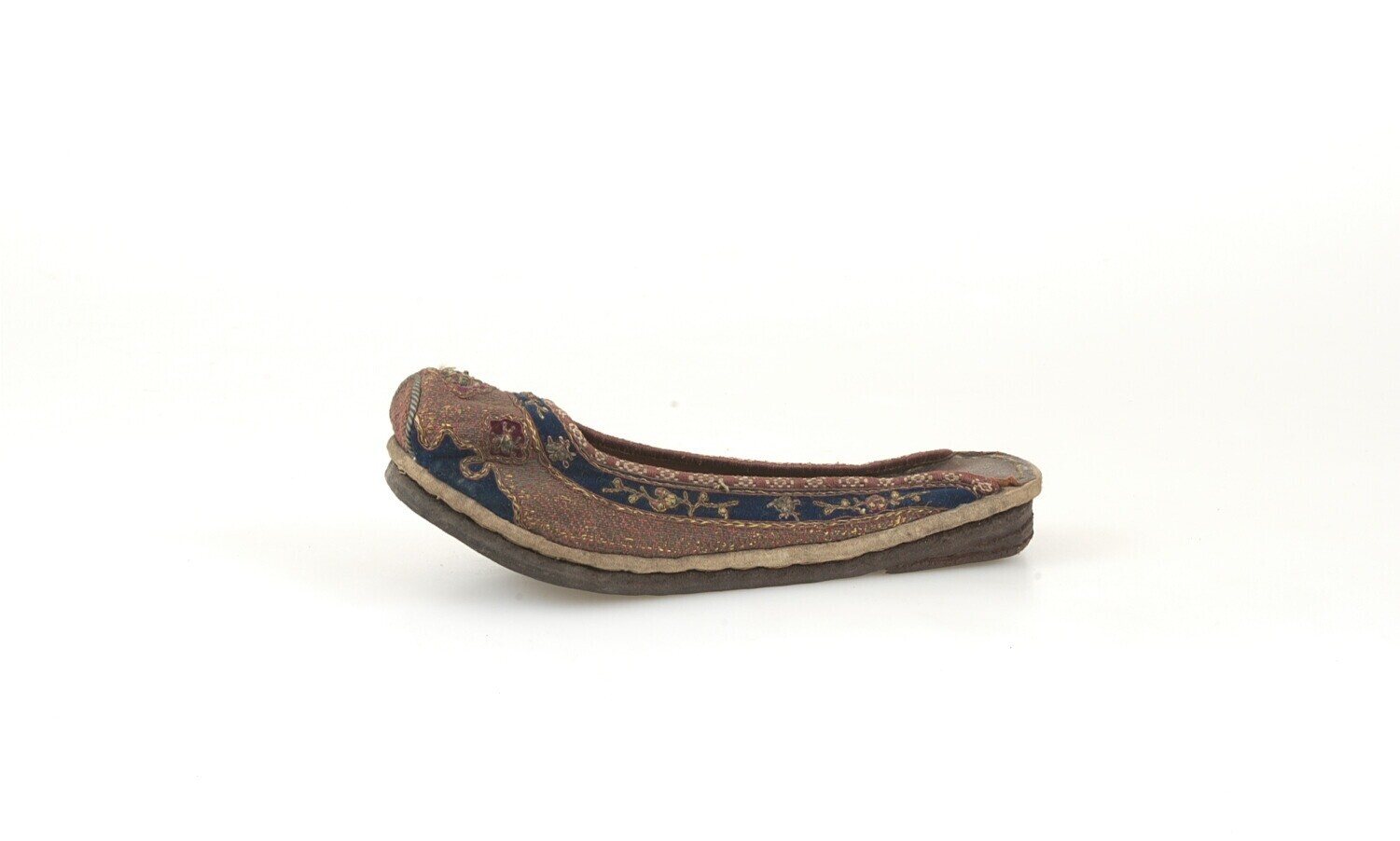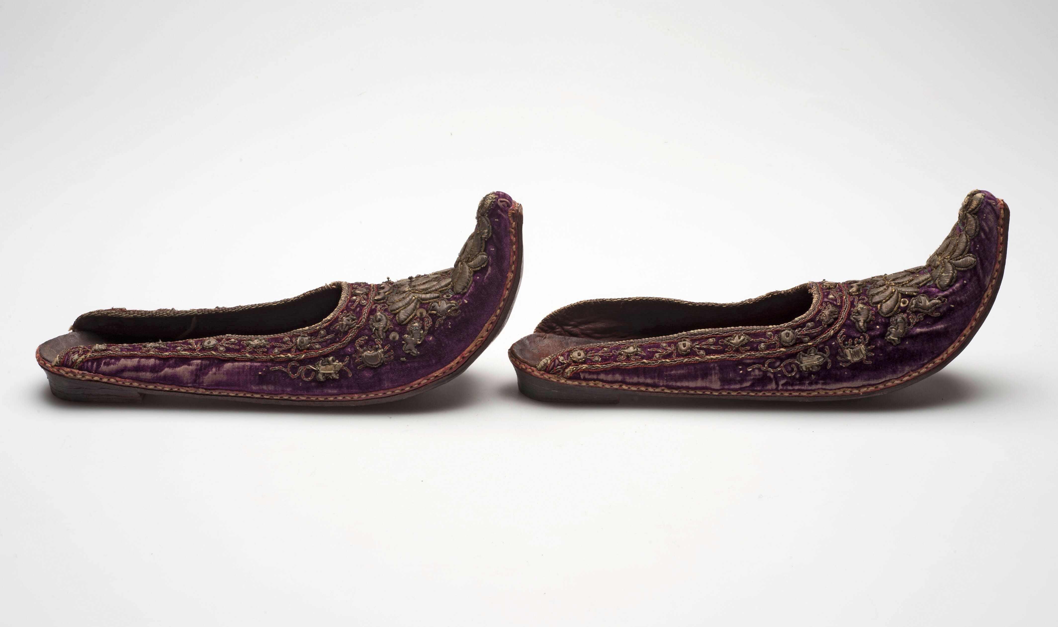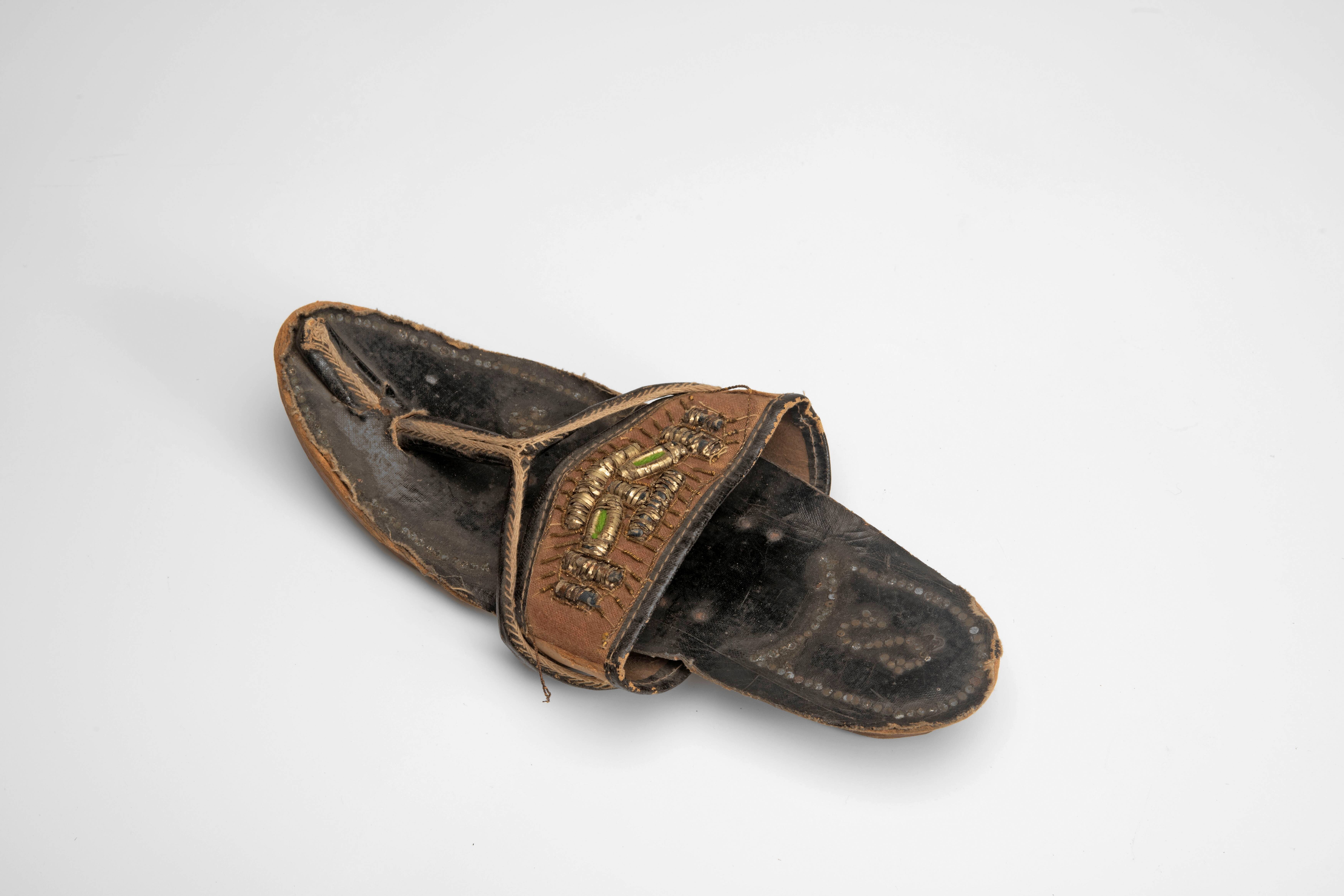 Muil van leer en fluweel met geborduurde bloemmotieven