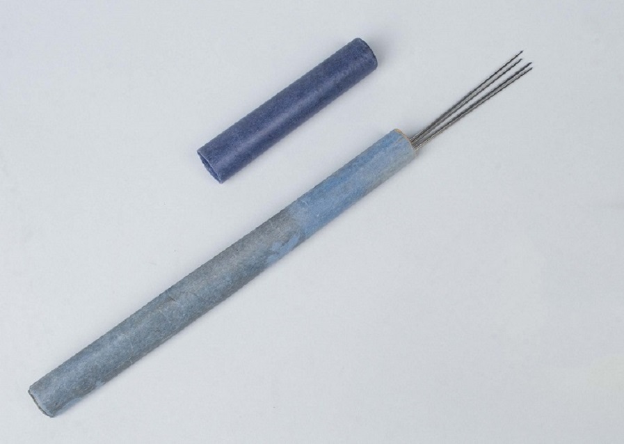 brenaaldenkoker, karton overtrokken met blauw papier...