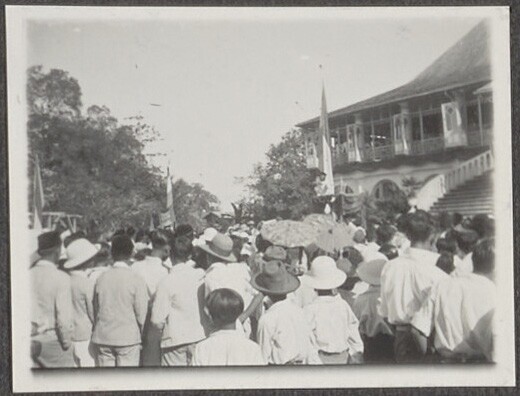 Mensen luisteren voor het residentiehuis in Palemban...