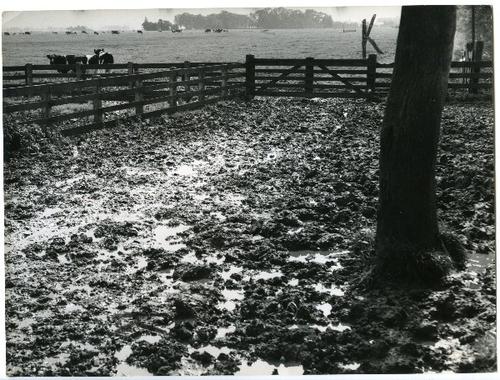 Foto in zwart-wit van drassige grond bij hekken en k...
